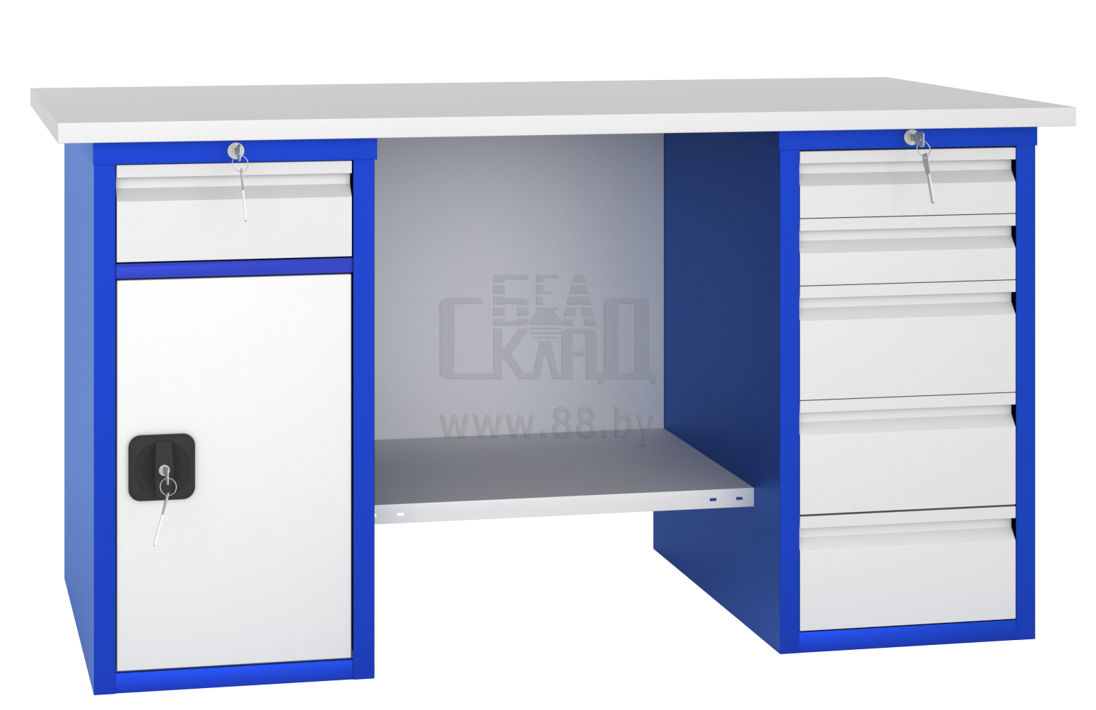 Столешница верстака выполнена из фанерного основания толщиной 28 мм. и покрыта оцинкованным листовым металлом толщиной 1,0 мм.Верстак двухтумбовый. Первая тумба комплектуется выдвижным ящиком (нагрузка на ящик до 25 кг., запирается на индивидуальный замок) и отделением с 1 регулируемой по высоте полкой (нагрузка на полку до 100 кг., запирается на индивидуальный замок). Вторая тумба комплектуется 5-ю выдвижными ящиками (телескопические направляющие с нагрузкой на ящик до 25 кг.). Тумба запирается на центральный замок с уровнем секретности 2 000 комбинацийМаксимальная нагрузка на верстак - 1000 кг.Оплата