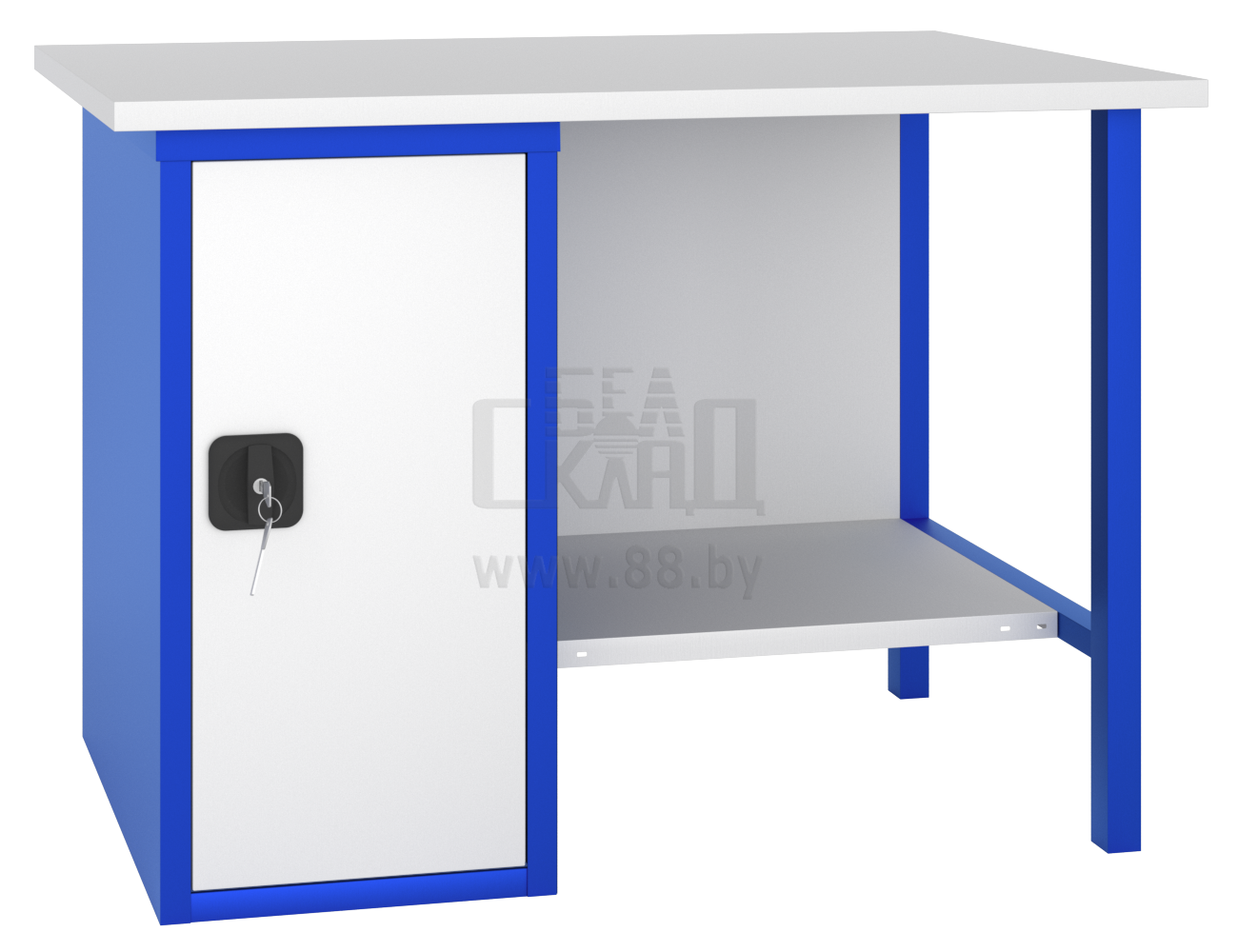 Столешница верстака выполнена из фанерного основания толщиной 28 мм. и покрыта оцинкованным листовым металлом толщиной 1,0 мм.Тумба комплектуется 2-мя регулируемыми по высоте полками (нагрузка на полку до 100 кг.) и запирается на замок с поворотной ручкой (нагрузка на полку до 100 кг.)Максимальная нагрузка на верстак - 600 кг.Верстак окрашен полимерной порошковой краской серого (RAL 7035) и синего (RAL 5005) цветаОплата