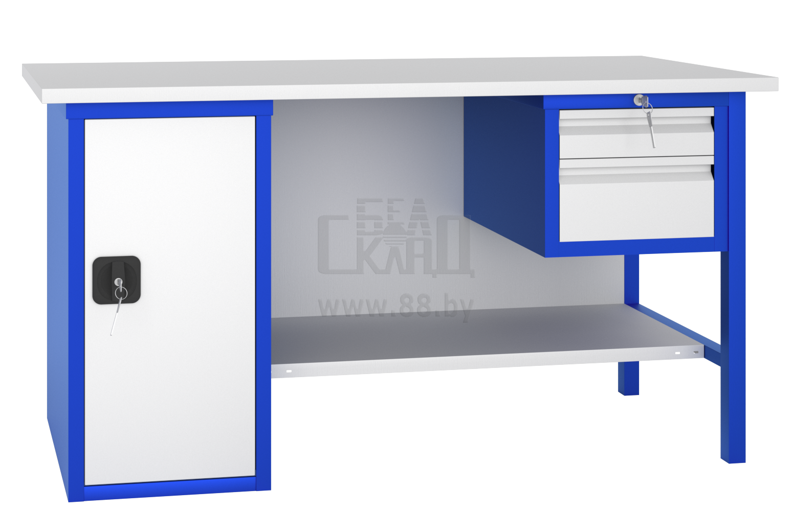 Столешница верстака выполнена из фанерного основания толщиной 28 мм. и покрыта оцинкованным листовым металлом толщиной 1,0 мм.2 тумбы: первая тумба с 2-мя регулируемыми по высоте полками (нагрузка на полку 100 кг.), вторая тумба комплектуется 2 выдвижными ящиками (нагрузка на ящик до 25 кг). Каждая тумба запирается на индивидуальный замокМаксимальная нагрузка на верстак - 600 кг.Оплата